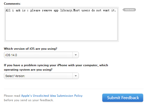 苹果产品使用意见反馈:英文版:https://www.apple.com/feedback/