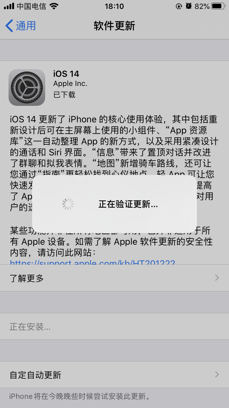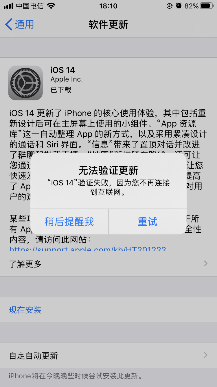1、正常从设置中升级:可以下载固件,点击开始更新后一直验证更新,大概2分钟后弹出“无法验证更新,验证失败,因为您已经不再连接到互联网”,用4G网络、Wi-Fi、甚至把Wi-Fi的DNS改为手动的8.8.8.8 和114.114.114.114也是不行,重启也不行,还原网络设置也不行。