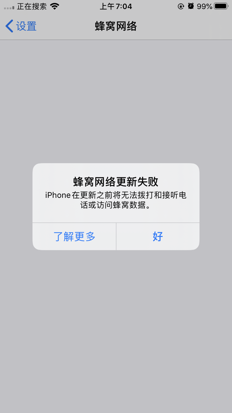 我用的是苹果7,晚上睡了一觉起来以后手机就没有信号了,还提示蜂窝网络更新失败,之前以为是系统没有升级导致的,去找别人把系统升级到14还是不能正常使用。