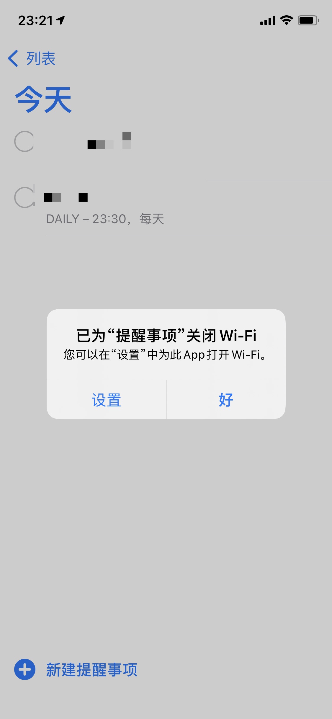 今天忽然个别app先报出了已为“提醒事项”关闭无线局域网