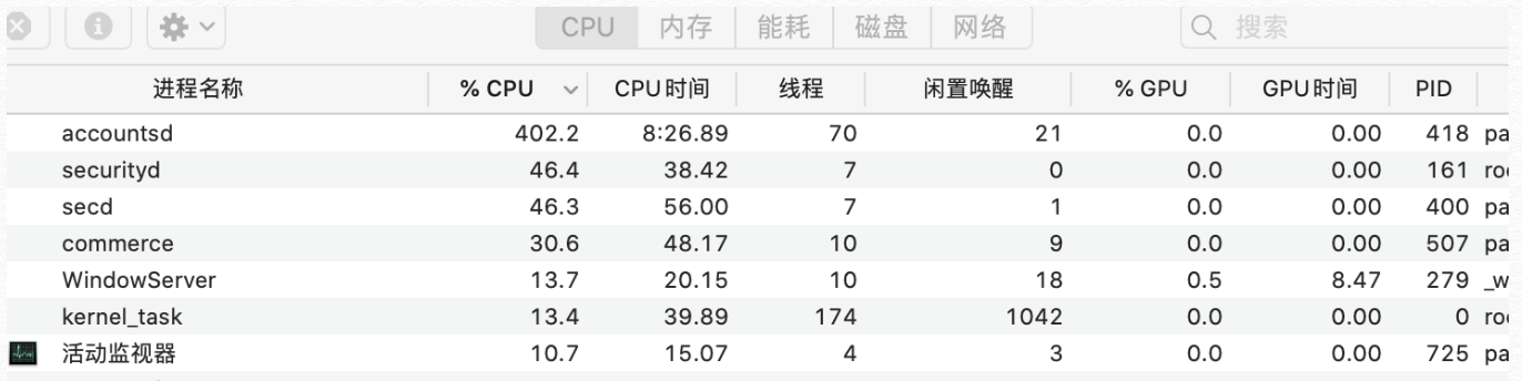 如果上面的不性:尝试将 “~/Library/Accounts” 目录移动到它处,然后立刻重新启动,查看 accountsd 是否不再占用过多cpu。尝试重