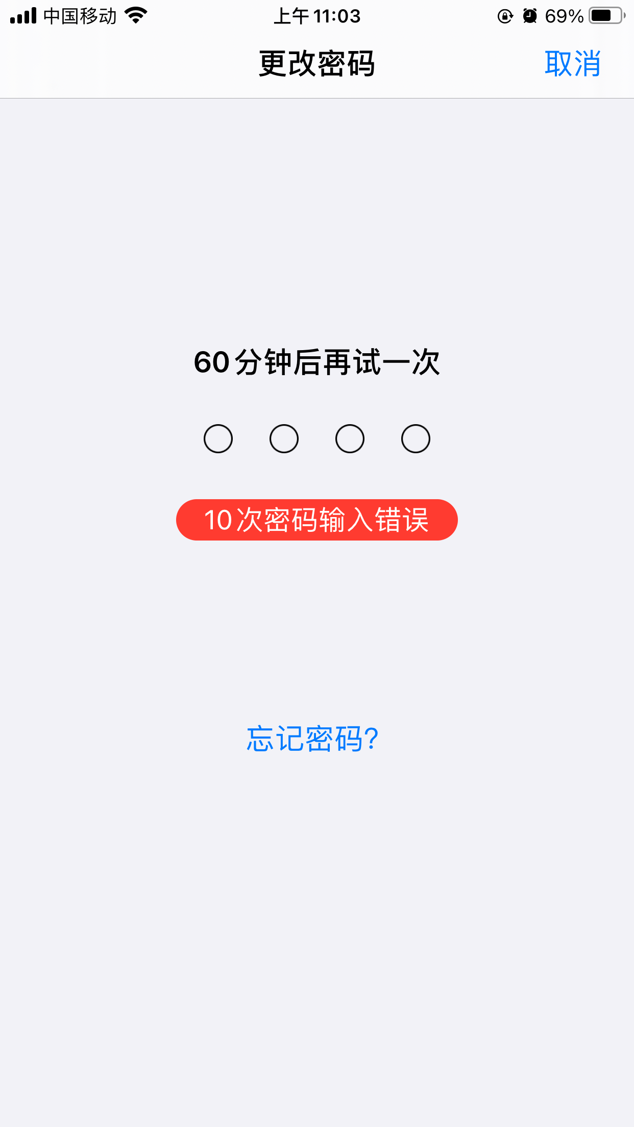 设置→屏幕使用时间→更改屏幕使用时间密码→更改屏幕使用时间密码→更改密码→忘记密码(输入Apple ID后)←更改密码 X次密码输入错误(反而增加了一次密码输入错误)