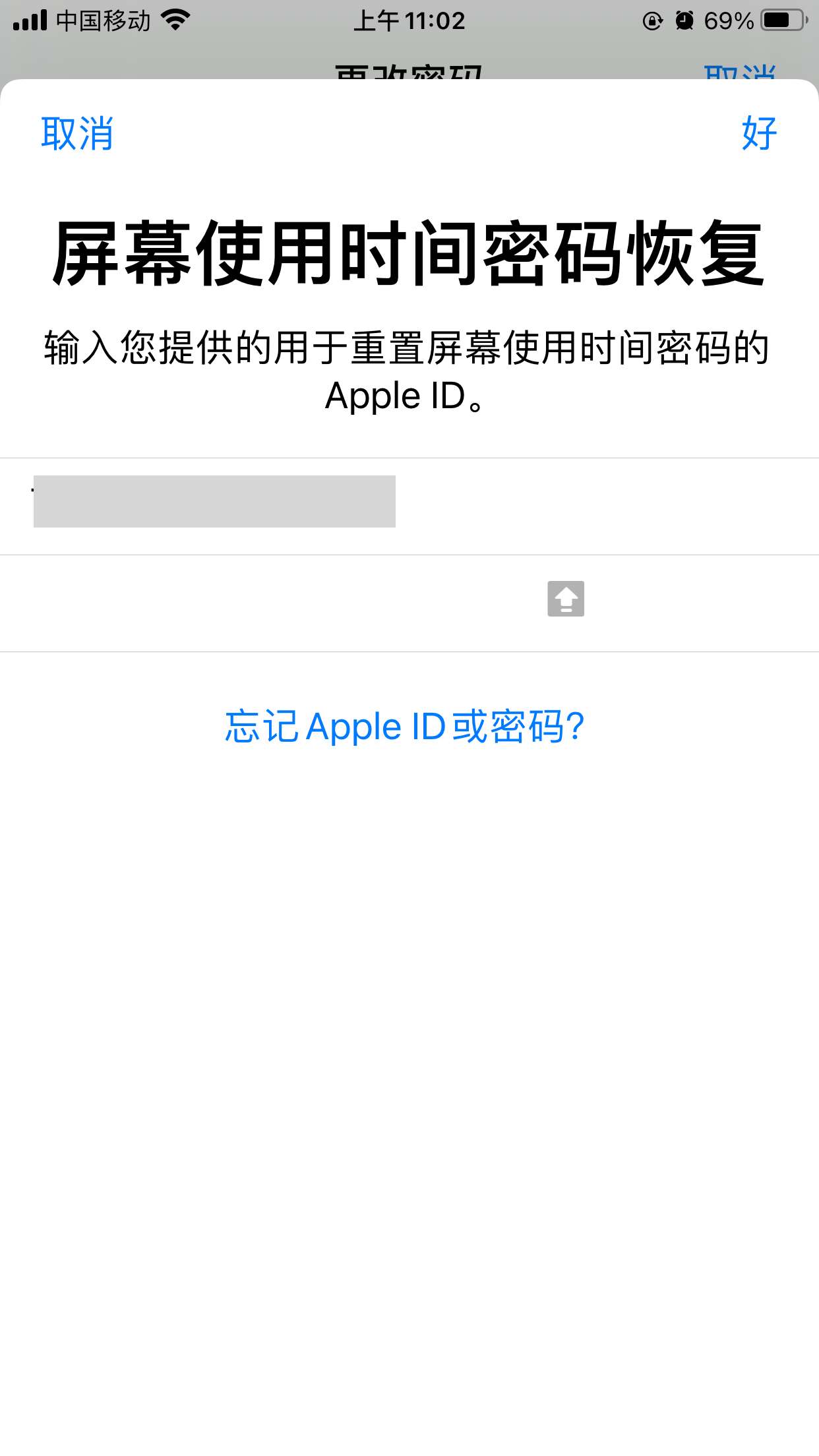 我的屏幕使用时间密码忘记了,于是我就点击“忘记密码”重置,但是我输入正确的Apple ID和密码后,却没有效果