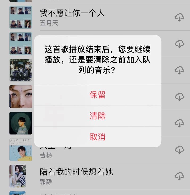 为什么苹果音乐在播放状态时,点击播放列表里的其他歌,总是跳出“这首歌播放结束后 您要继续播放 还是要清除”?每次点任何一首歌都会出现,每个播放列表都是这样!