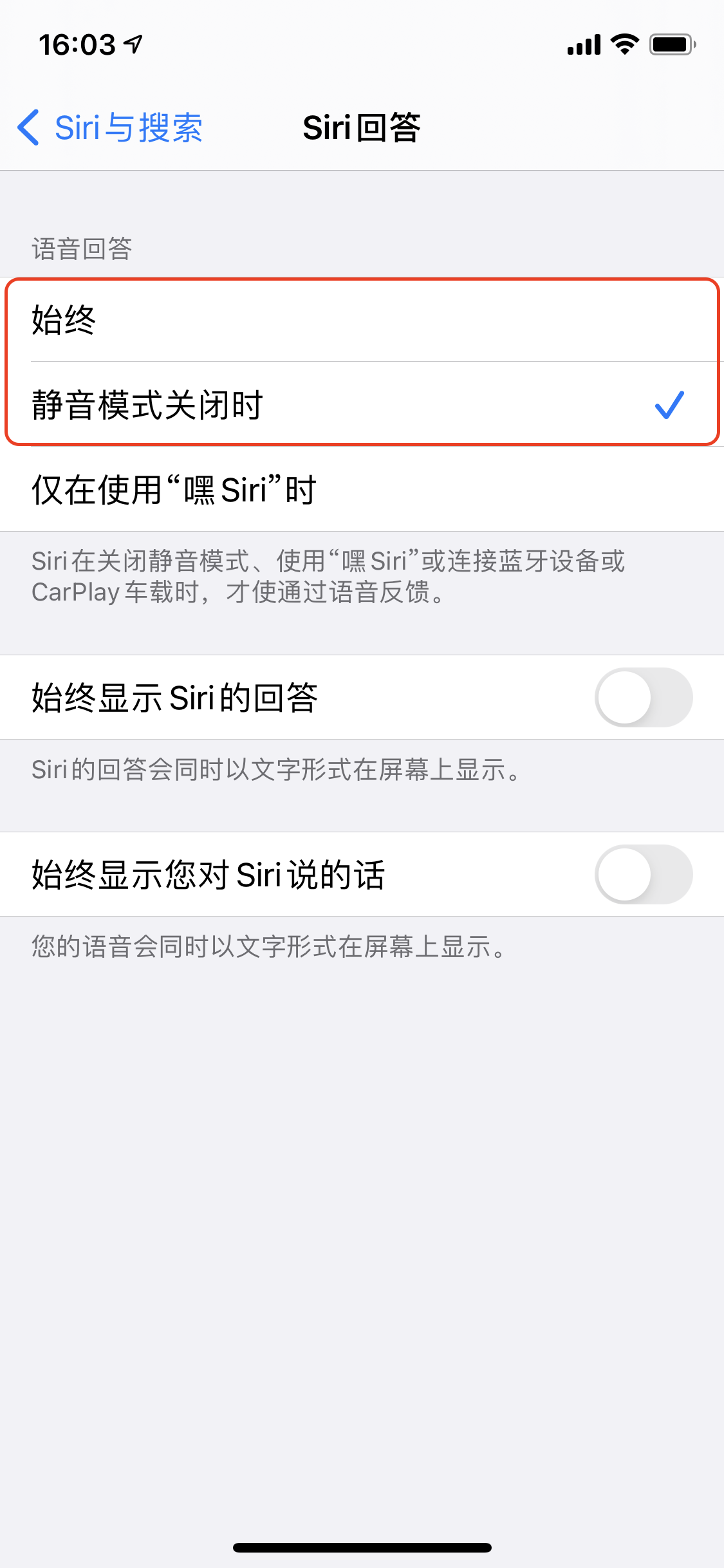 进入“设置”-“ Siri 与搜索”-“ Siri 回答”在里面检查语音回答的方式确保没有勾选到“仅在使用‘嘿 Siri ’时”如果勾选了这个选项只能用“嘿 Siri ”的方式唤醒 Siri 才会有语音反馈。