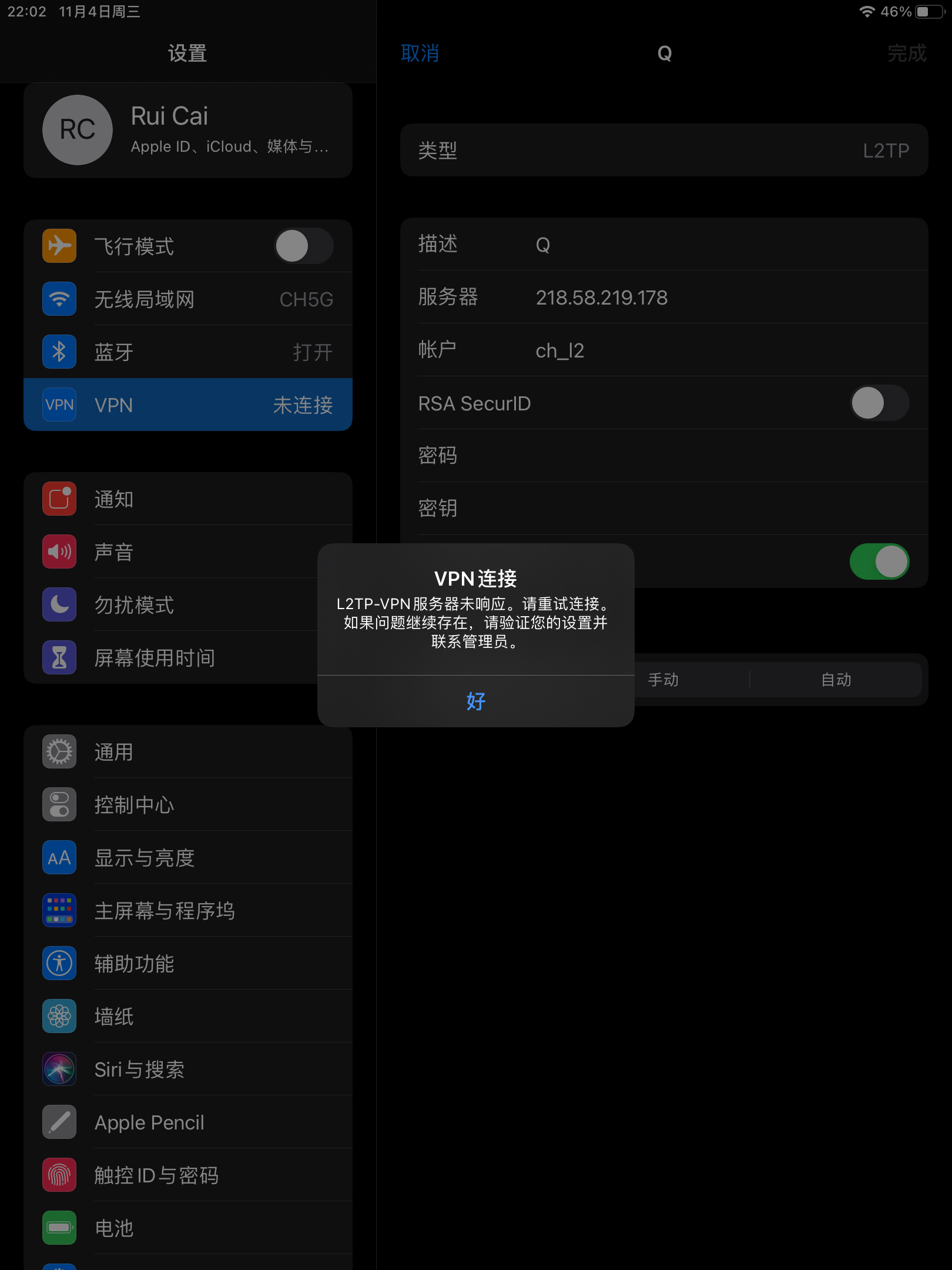 iPad昨天升级了14.1,周末在家使用l2tp/ipsec 连接到办公楼时发现,连接不上了。使用我苹果手机连接没有问题。iPad连接我手机热点也是连接失败,所以才反馈到这里,请专家们帮我解答一下问题。