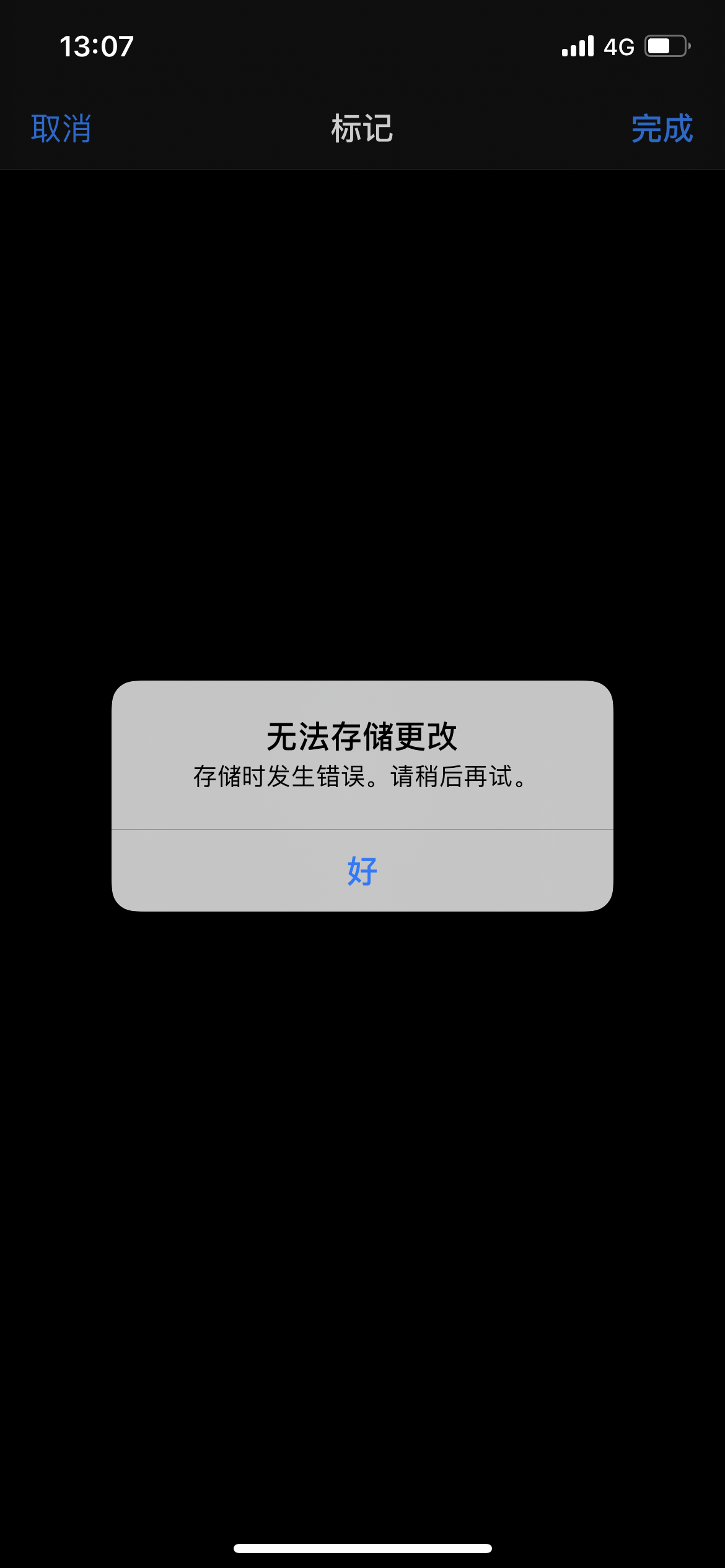如图所示,使用系统自带的标记功能编辑照片后,一直提示无法存储更改