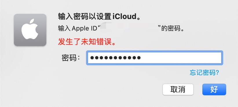 在设置iCloud信息同步时,输入密码后总是提示"发生未知错误"。系统版本10.15.7 (19H2)