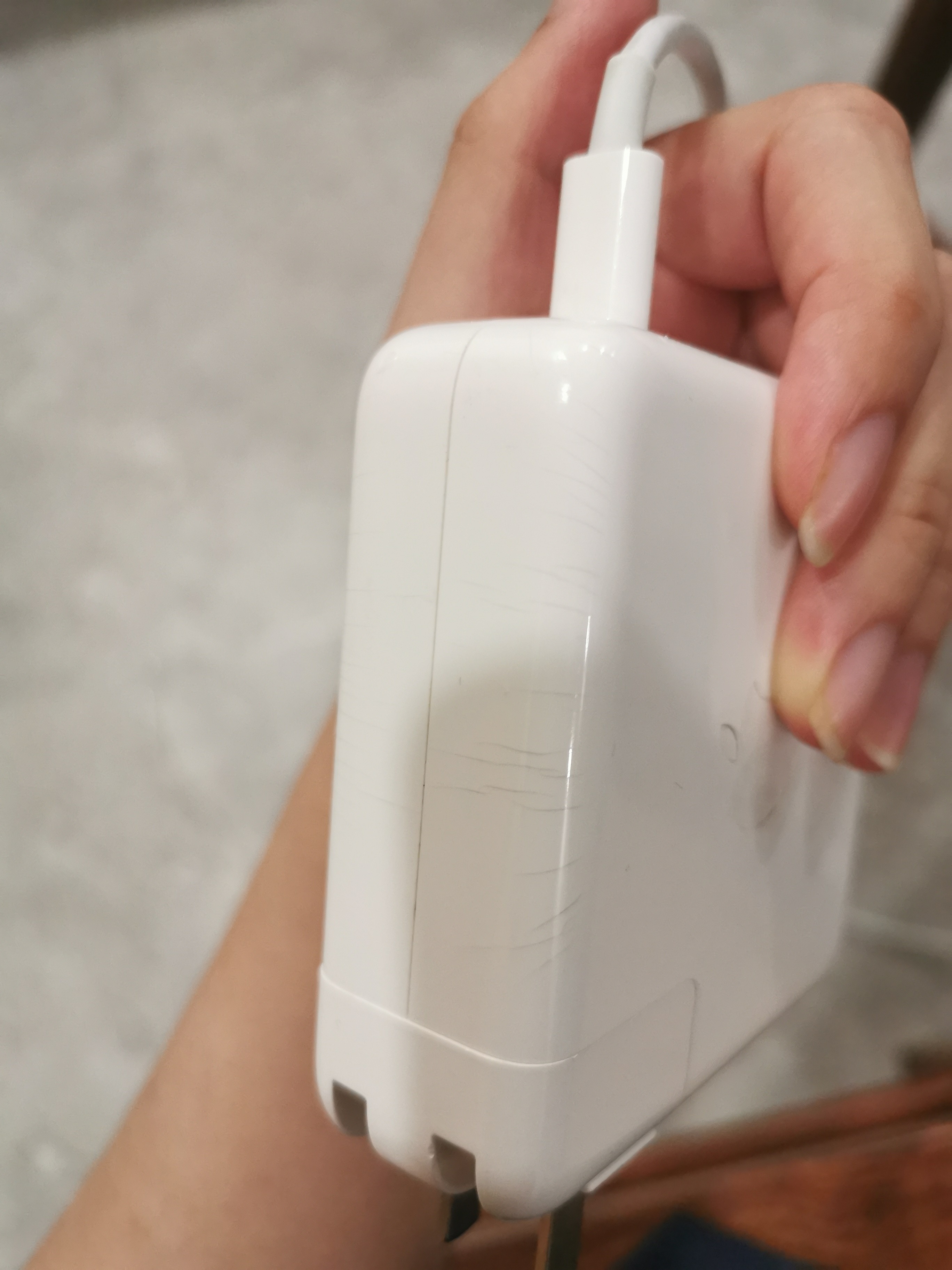 看起来像是塑料龟裂纹,可能是由于长时间的应力(加上充电头工作时候会自发热)导致的,如果只是轻微的表皮裂纹不影响使用,但安全起见建议题主有时间预约到就近的 Apple Store 或者授权经销商让工作人员帮忙看看。