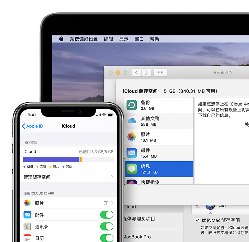 通过 iCloud,您可以储存自己最喜爱的内容,并使它们在已使用您的 Apple ID 登录的所有设备上保持最新。您可以免费获得 5 GB 的 iCloud 储存空间,并可以随时购买更多储存空间或腾出空间。