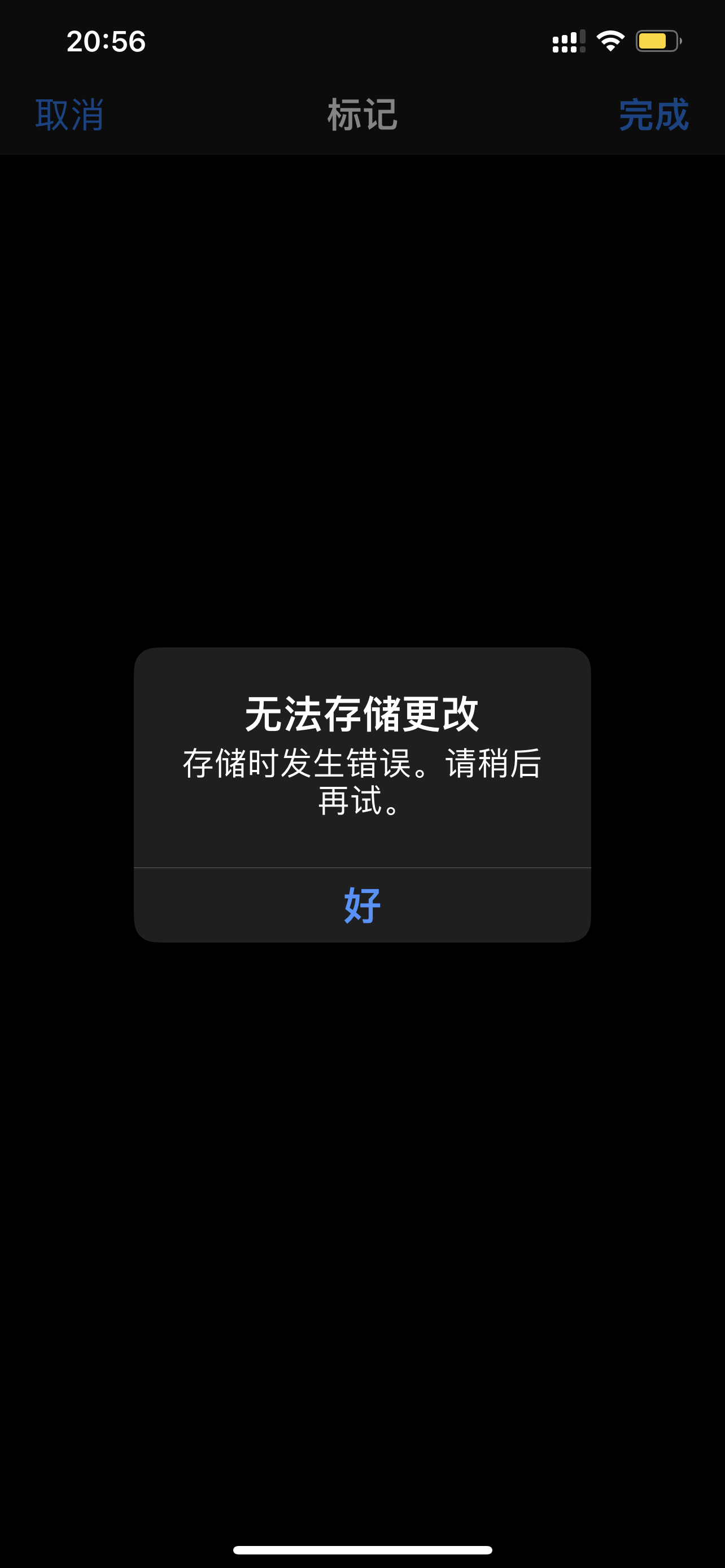 所有截图图片在使用编辑中的“标记”后当选择“完成”时都会提示无法储存更改,然后当选择“取消”“放弃更改”就会卡在编制界面,必须在多任务界面把任务“照片”去掉才能重新打开