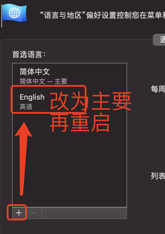 在【系统偏好设置】里点击【语言和地区】点击"+"号,增加“英语”设置为主要语言,然后重新启动。