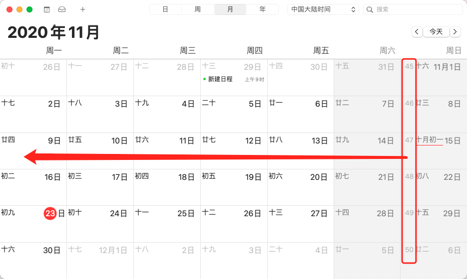 MacBook日历App,如何将「周数/星期数」展示在周一,而非目前展示在周日?