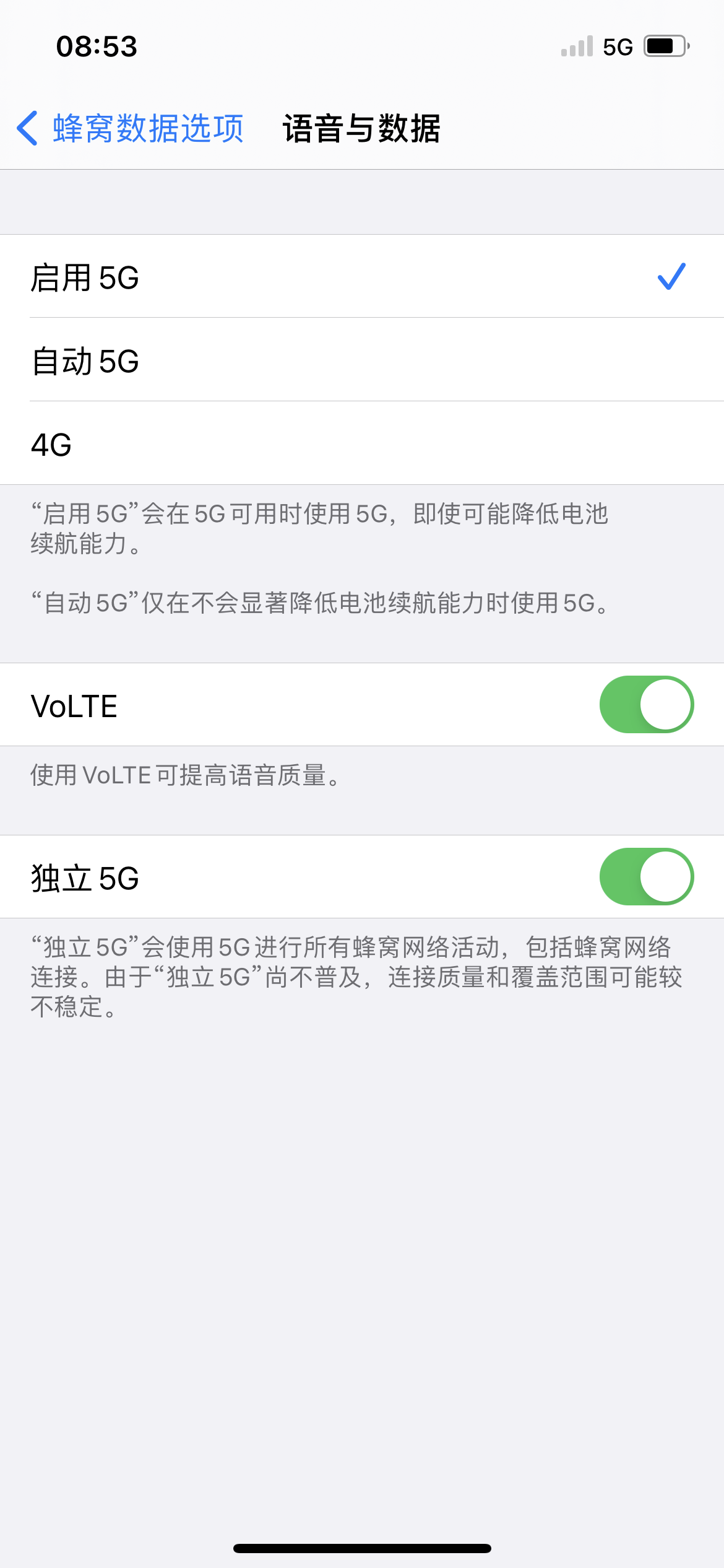 “独立5G”就是SA 5G,现在大部分基站还是NSA 5G,如果打开SA 5G的话,就不会加入NSA 5G的基站了,所以会出现无信号的情况