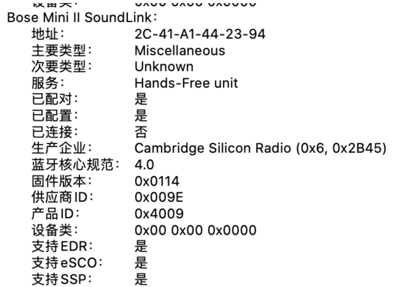 在升级到macOS Big Sur 11.0.0时一切正常,但当升级至11.0.1时出现无法使用BOSE MINI II的蓝牙音箱,不管是使用原有的配对信息连接还是进行重置删除链接重新配对(音箱已经里面的连接列表已经清除,并且是最新的版本固件),出现的故障都是可以进行配对,但在喇叭的那个输出音频列表中均无法看到所连接的音箱,并且在一会儿后所连接的蓝牙音箱就自动断开了,当音箱和手机(IPHONE 7)进行配对连接时,一切正常,没有出现任何问题。