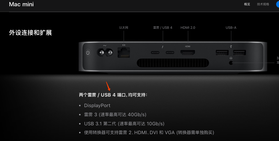情况是这样,在看到官网机型介绍中新款Mac mini支持两个雷劈/USB4端口,