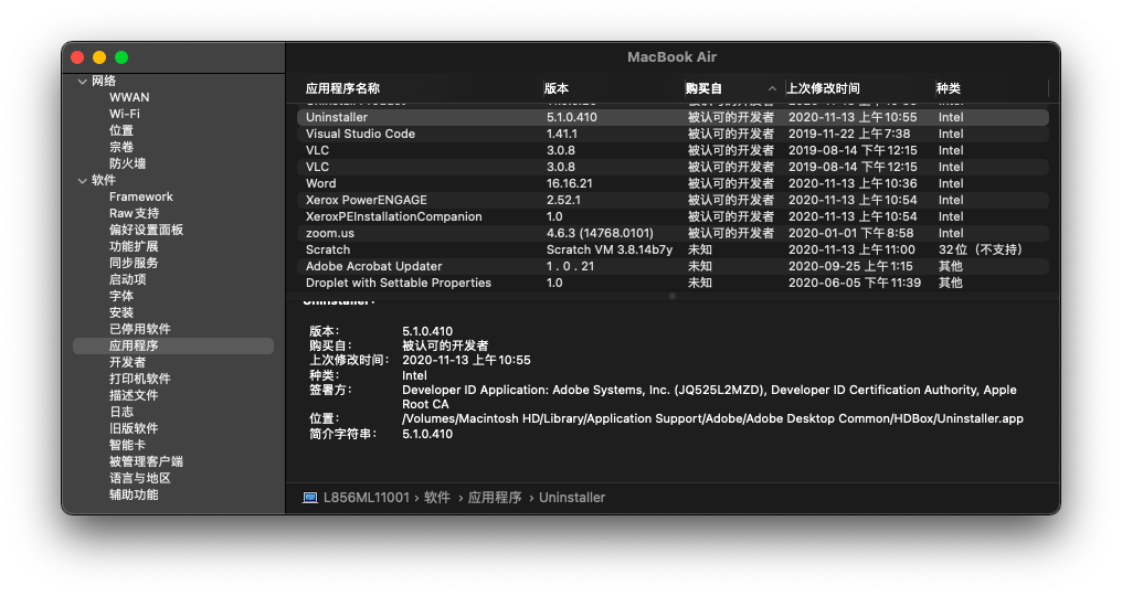 点击每个应用,在下方的详细信息面板中,观察它的种类,如果是 Intel 的,找一找这个软件是否有 M1 版本的,如果有,就替换它;如果没有,自己先做个标记。