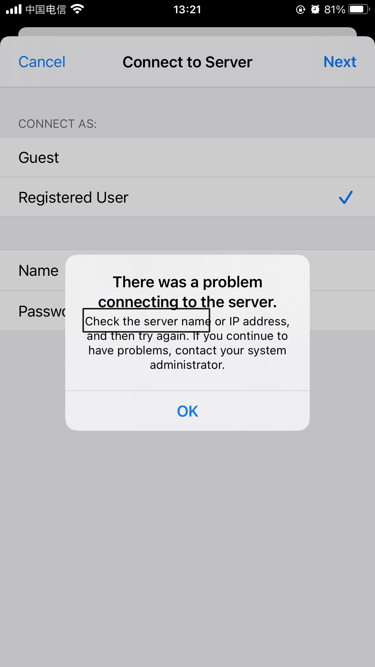 约半小时前,我通过apple支持了解到文件app的“连接到服务器”功能现仅支持输入ip地址,不再支持通过计算机名连接,但错误报告中仍提示”请提供正确的服务器名称或ip地址“,具有极强的迷惑性。