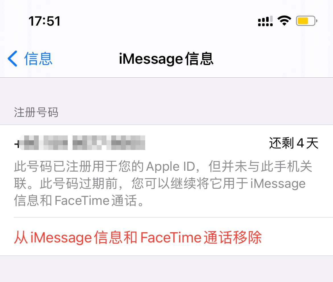 直接点击红色文字“从iMessage信息和FaceTime通话移除”先移除掉,然后再勾选一下电话号码或者邮箱就可以了。(可多选)