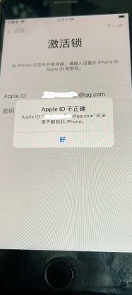 我的iPhone8因为被骗子套路,陷入了“此iPhone已丢失并被抹掉,请输入设置此iPhone的Apple ID和密码”的状态;一段时间之后,我用Apple ID账号所关联的手机号重置了自己的Apple ID密码,当我输入Apple ID和新的Apple ID密码后,却被提示“Apple ID不正确”、Apple ID“XXXqq.com”无法用于解锁此iphone。(我现在是能够用原本的Apple ID和修改之后的Apple ID密码登录我的Apple ID账户网站的。)