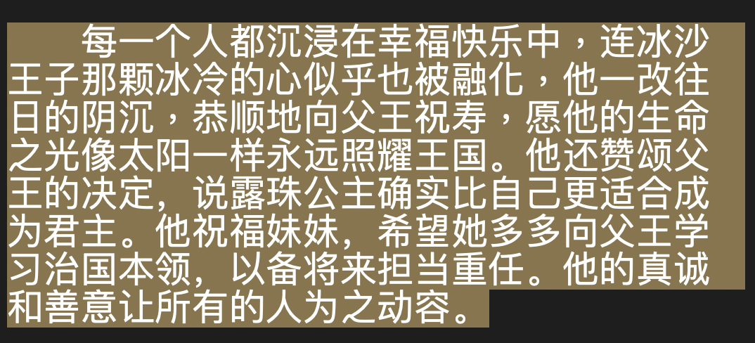 每一个人都沉浸在幸福快乐中,连冰沙王子那颗冰冷的心似乎也被融化,他一改往日的阴沉,恭顺地向父王祝寿,愿他的生命之光像太阳一样永远照耀王国。他还赞颂父王的决定,说露珠公主确实比自己更适合成为君主。他祝福妹妹,希望她多多向父王学习治国本领,以备将来担当重任。他的真诚和善意让所有的人为之动容。