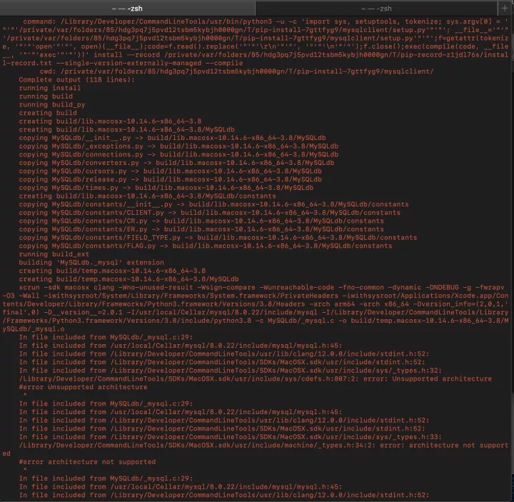 裝完mysql-connector-python不需要裝 mysqlclient, 至於報錯, 你需要發文字版上來.