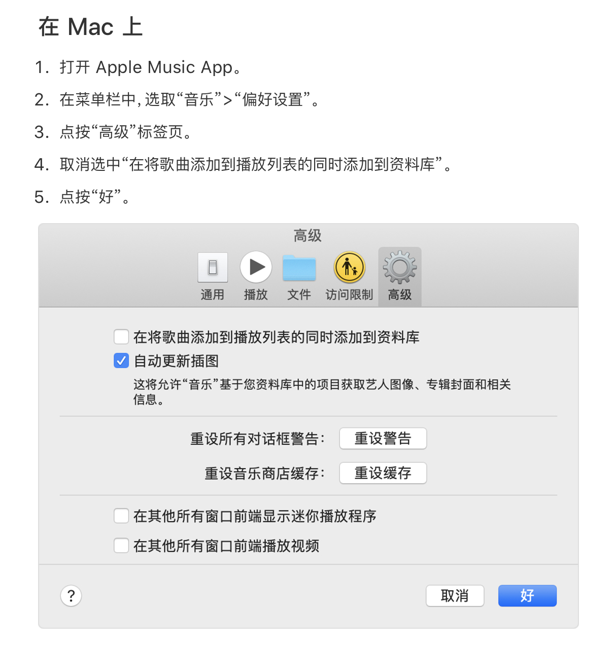 如何禁止将音频文件用mac 音乐打开后自动添加到资料库?
