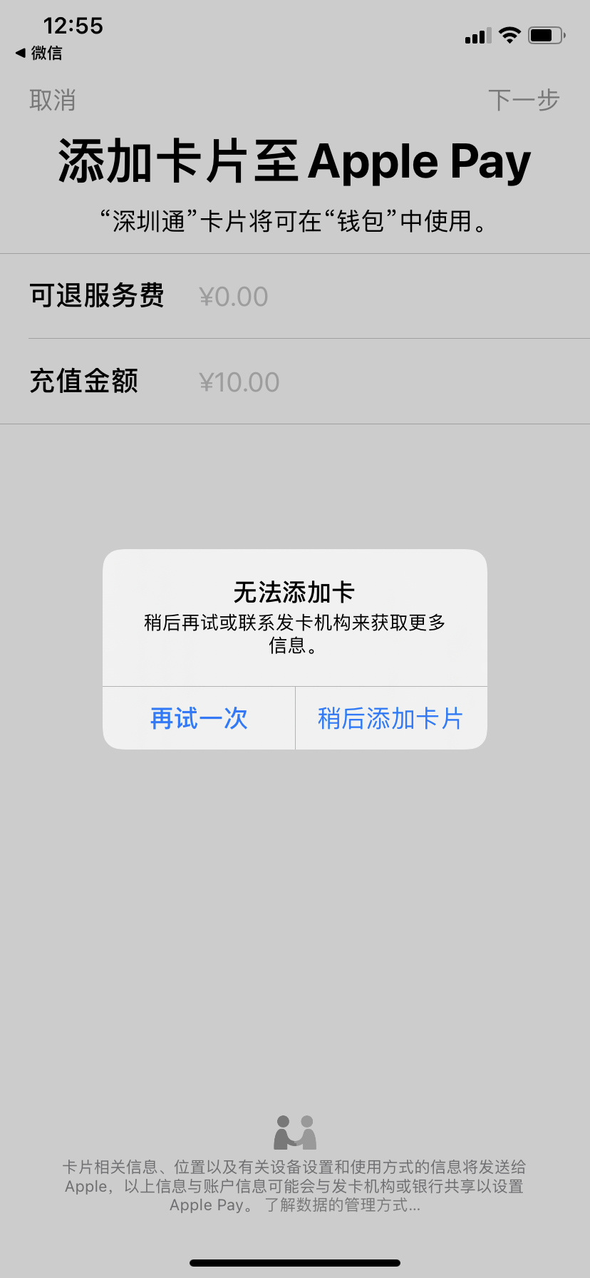 ApplePay无法添加公交卡,在付款完成后提示“无法添加卡”。