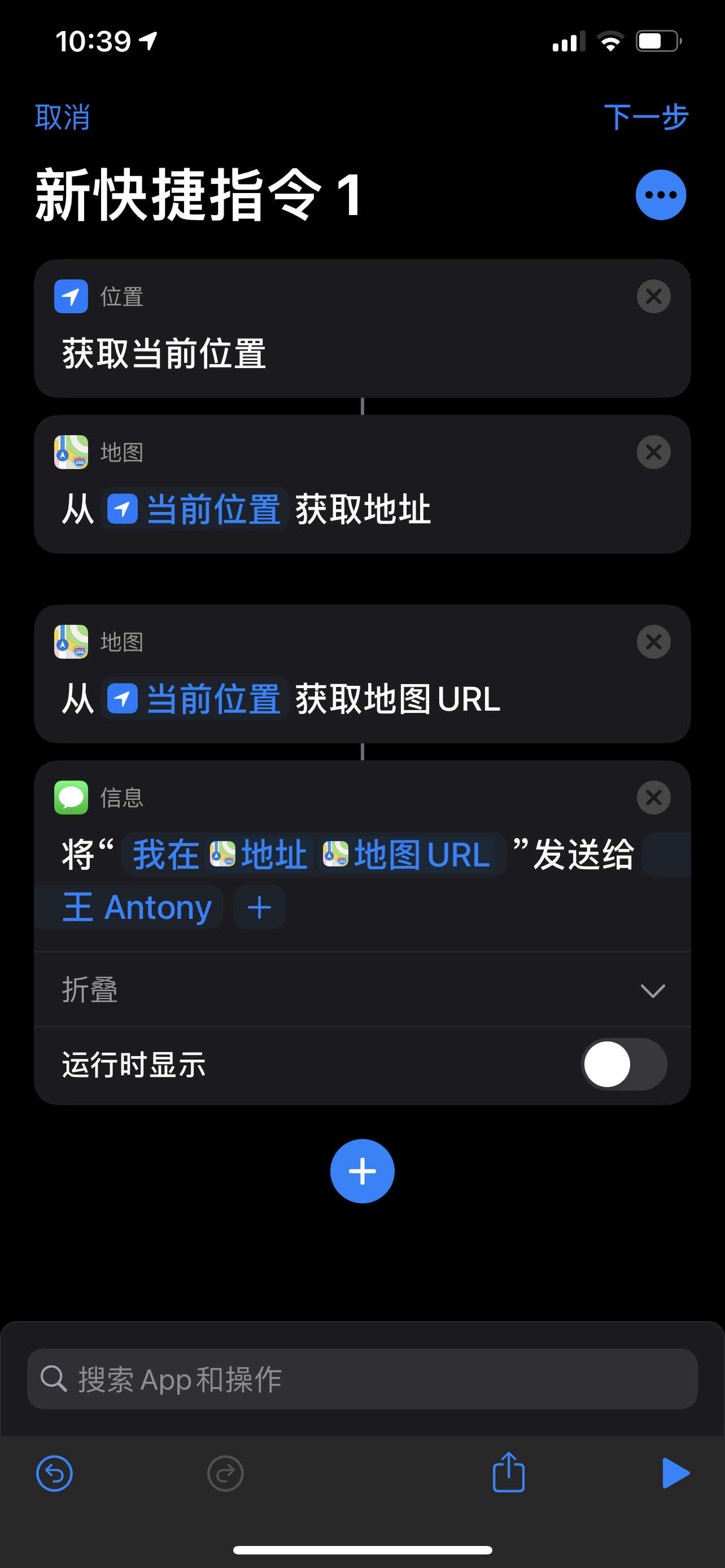 添加操作-发送信息(将变量地址和地图URL添加到发送信息动作中的将后面,然后添加要发送的人。把运行前询显示关闭
