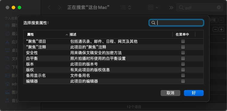 另外,当点击上图中的“名称”,然后选择“其它”,它会列出所有可能的 macOS 支持的可搜索的属性: