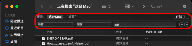 如果经常需要这个搜索,编辑好条件后,点击“存储”,可以把它添加到 Finder 左边栏中。