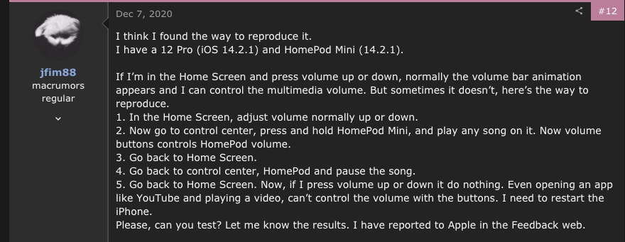 我的刚买的12也是这个问题,用了一个月左右,已经大小4-5次按音量加减键没反应了,只能重启手机问题恢复正常,我家也有homepod,不知道问题和这个有没有关系,个人感觉关系不大,希望苹果尽快解决!