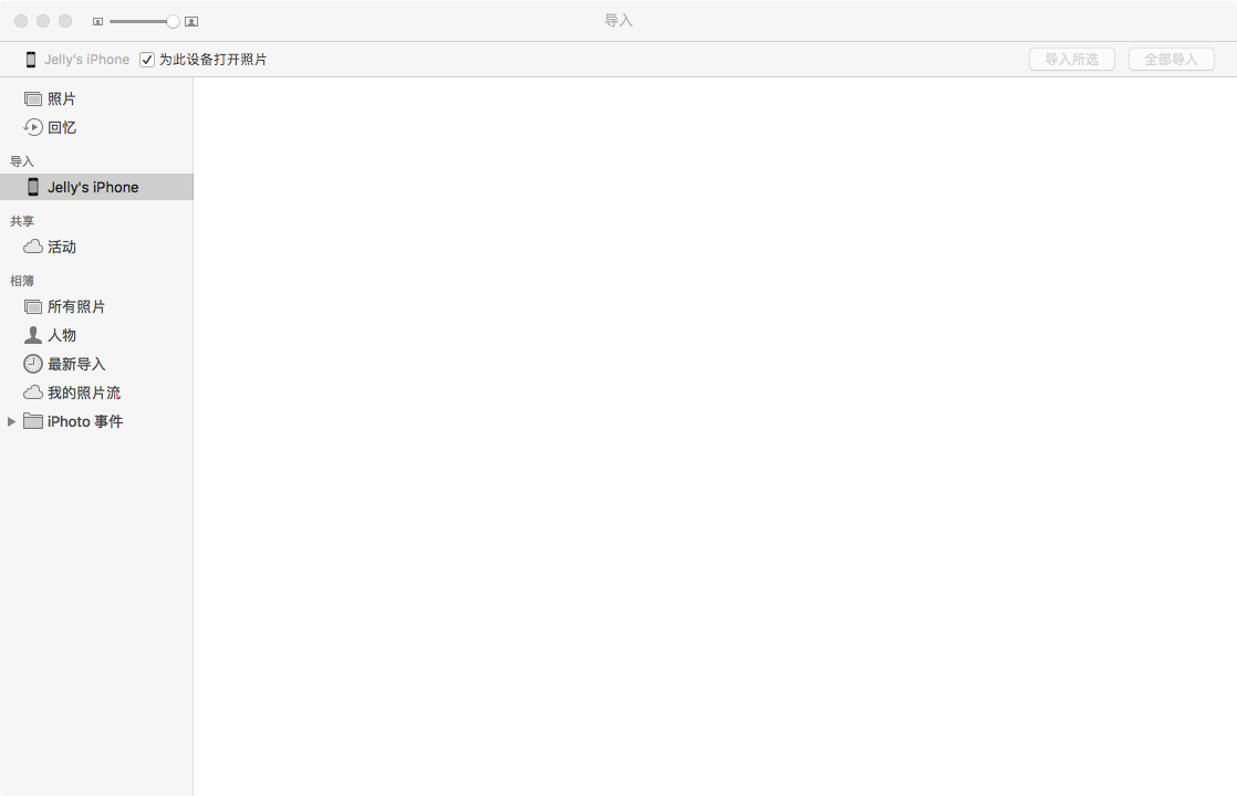 打开mac上的照片应用,导入界面那里不显示手机中的照片