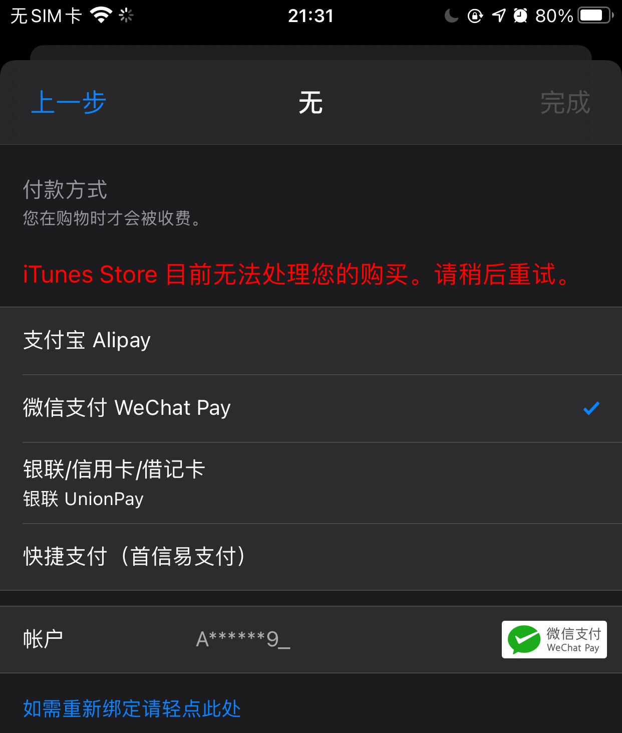 今天下载软件的时候发现需要认证 输入密码后进入了修改支付方式的界面 点右上角的编辑后 点击完成 后显示无法处理购买 进入设置重新绑定支付方式可以成功但是无法下载软件 却能在Apple store里给无法下载软件的Apple id充值 且充值成功。另外昨天在充钱的时候没有收到扣费消息以为会延迟就没理 到今天发现确实没有扣费 或许是这个原因 咋解决啊啊啊啊啊