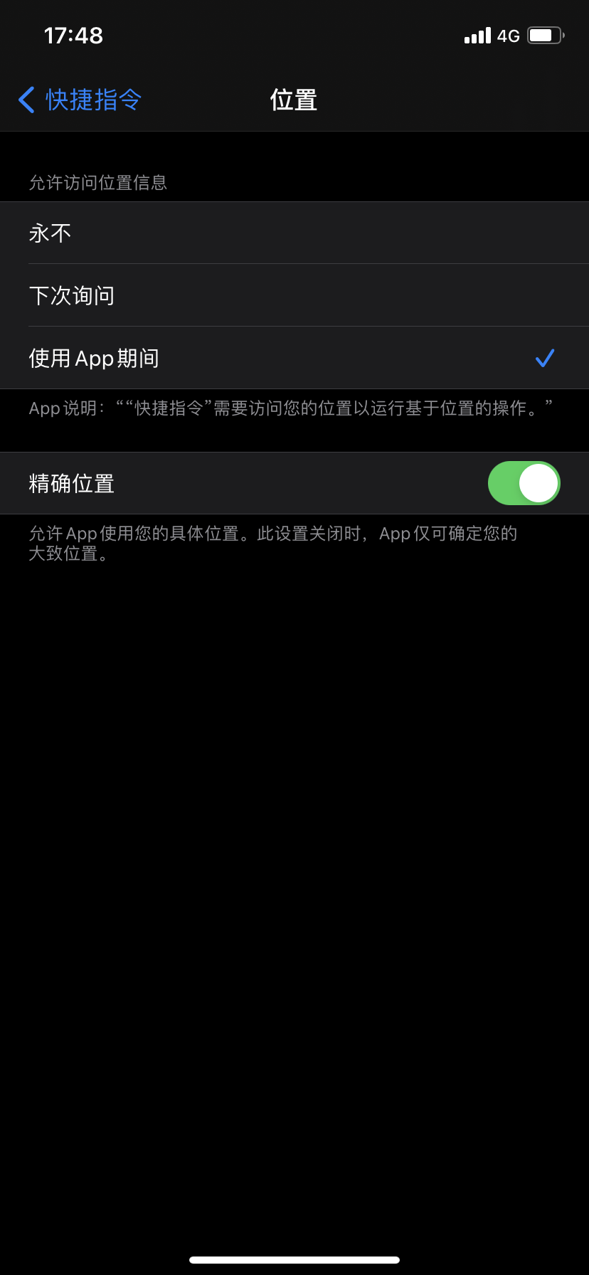 我自己弄了一个快捷指令 意在提醒自己下班打卡 然后设置了离开公司位置100米后手机震动提醒 通知提醒 结果我试了一下发现根本没用 快捷指令只能在使用期间获取位置 准备想换一种方式 断开公司Wi-Fi后 提醒 结果也只有连接并没有断开 既然不让一直获取位置为什么有到达或离开某位置执行快捷指令?设计这个到达或离开某位置的初衷是什么?