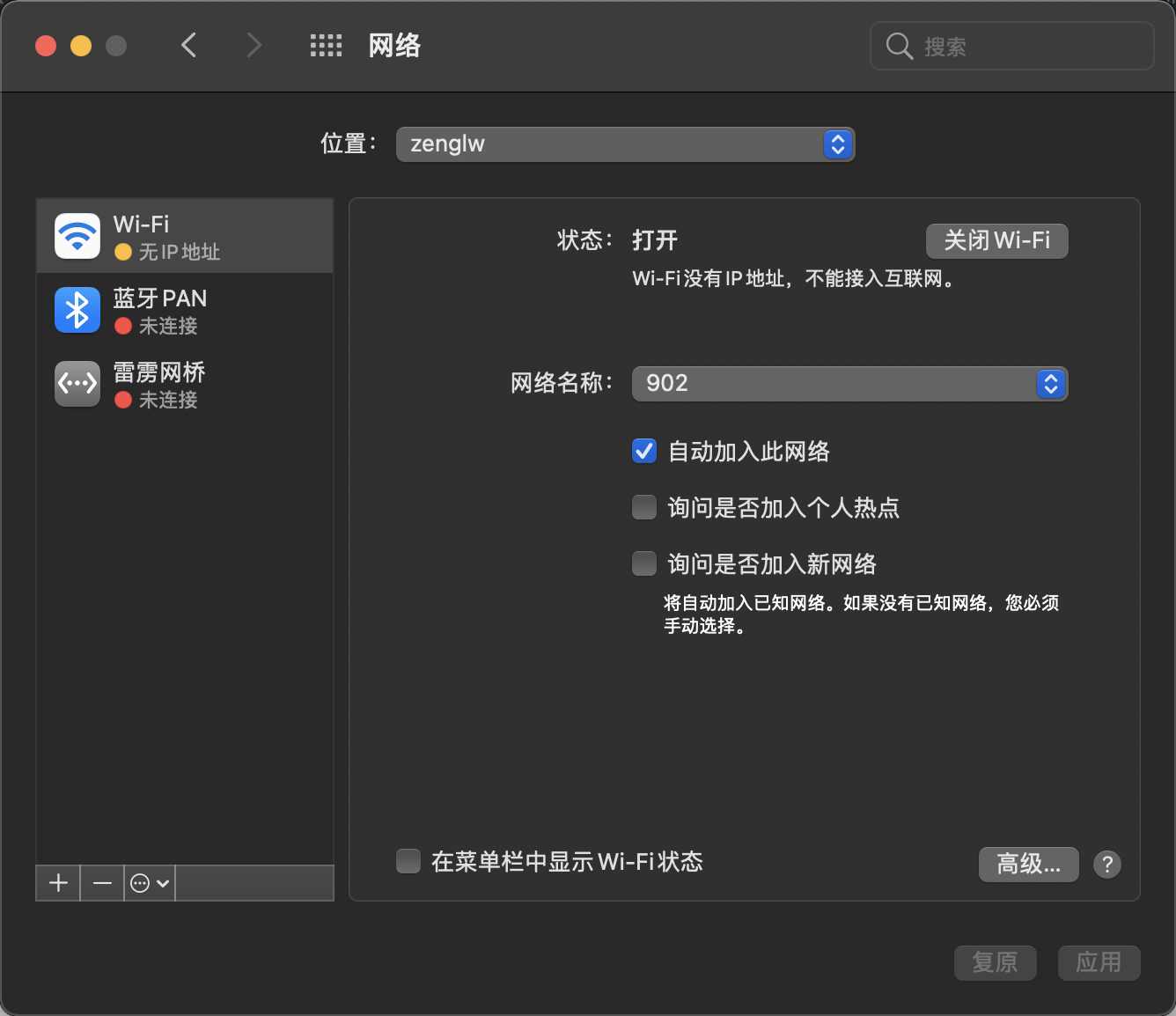 Macbook Pro 15寸 18款,盒盖一段时间后,然后在打开,出现wifi无法获取到ip地址的情况