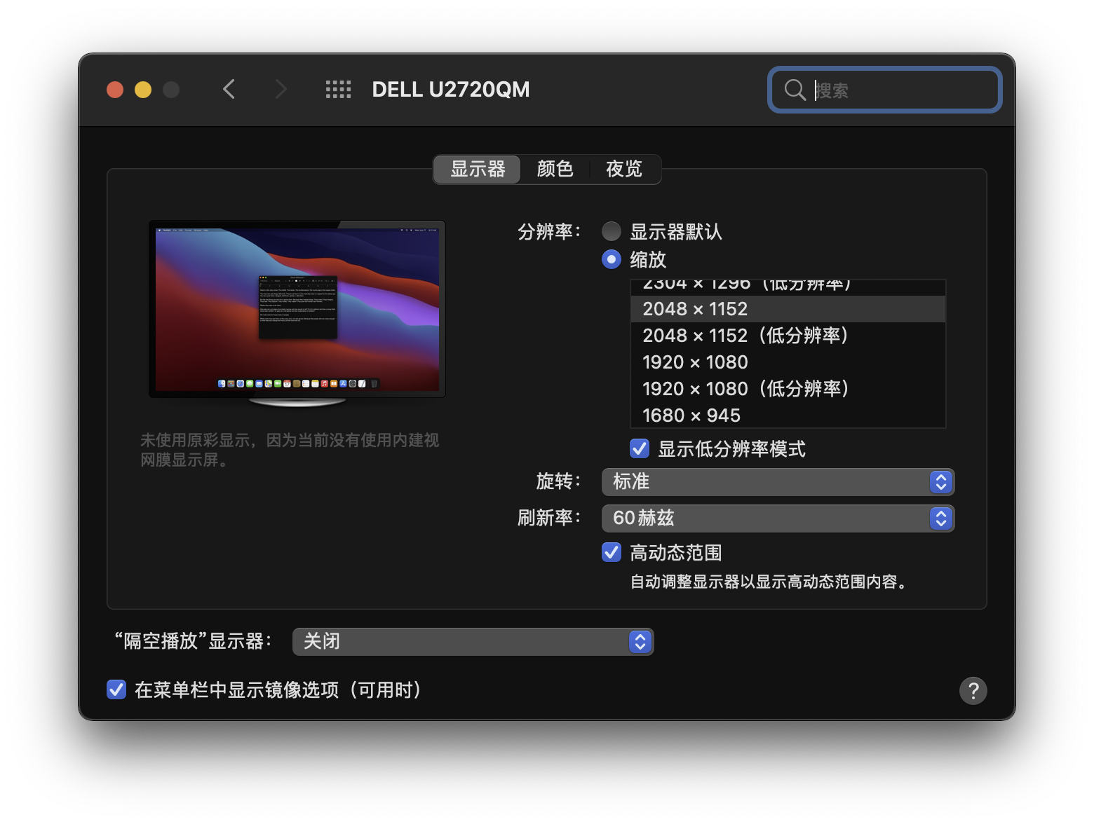 以下用户的用户个人资料: SparkWu SparkWu 用户级别: 级别 7 28,318 积分 2021年1月11日 下午9:27 回应 朝督 试试这样:点击 菜单,选择“系统偏好设置”选择“显示器”,停留在外置显示器窗口按住键盘上 Option ⌥ 按键时点按“缩放”勾选“显示低分辨率模式”查看下方“刷新率”信息 回复 链接