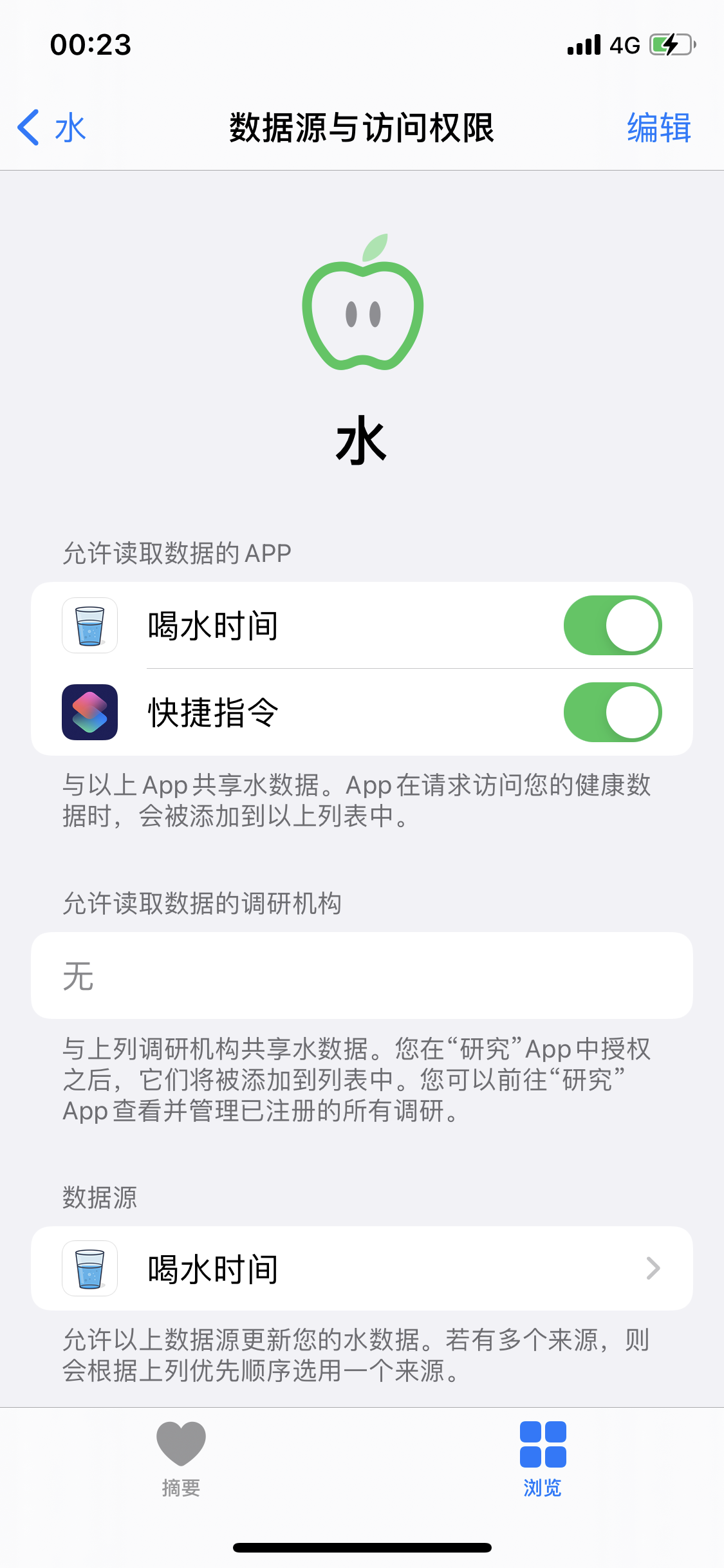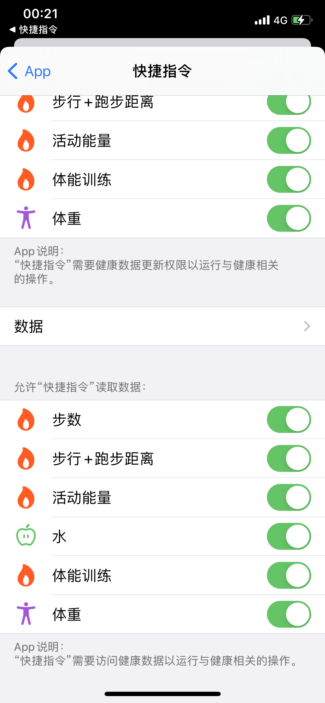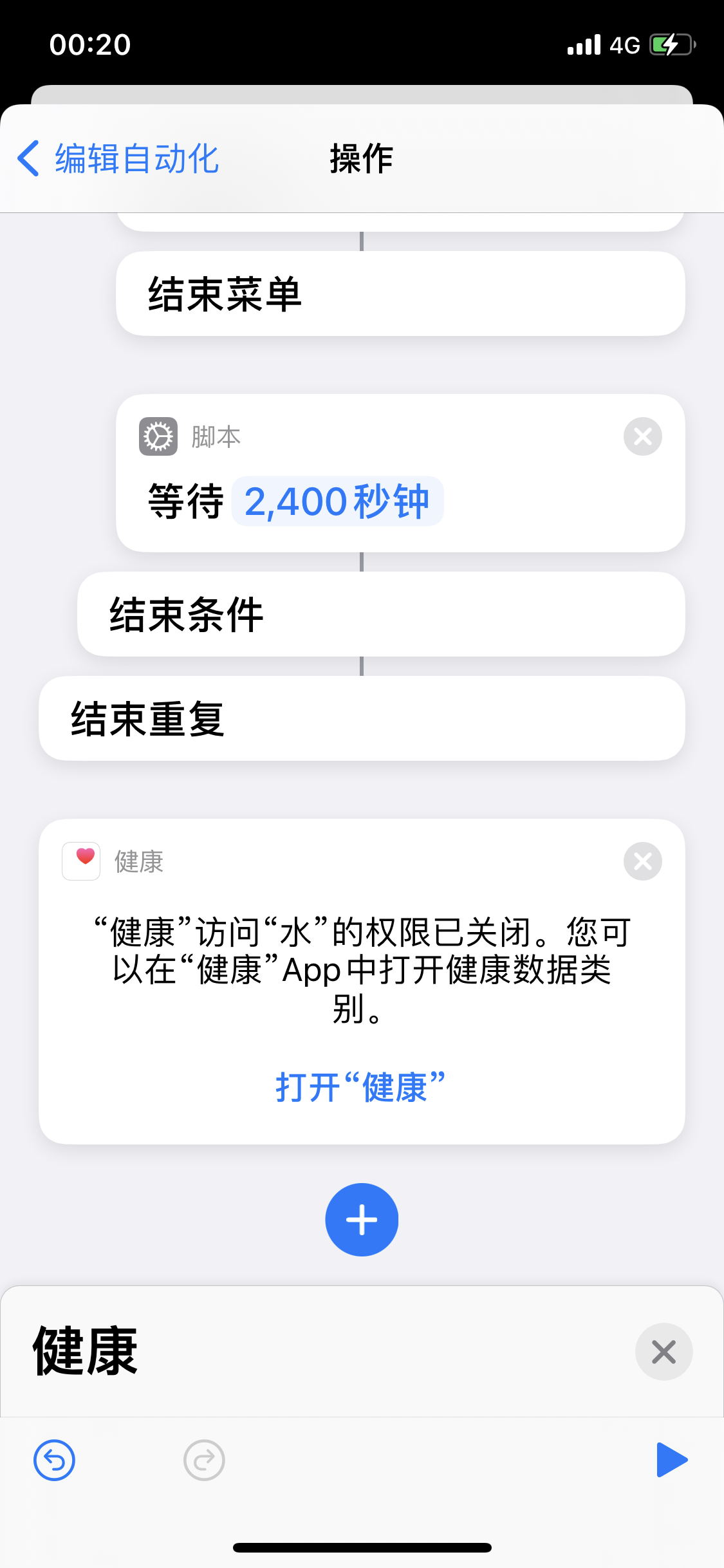 问题:快捷指令记录健康的饮水量,提示“健康”访问“水”的权限已关闭,但在健康中已打开了相应的权限,相关的截图见附件。