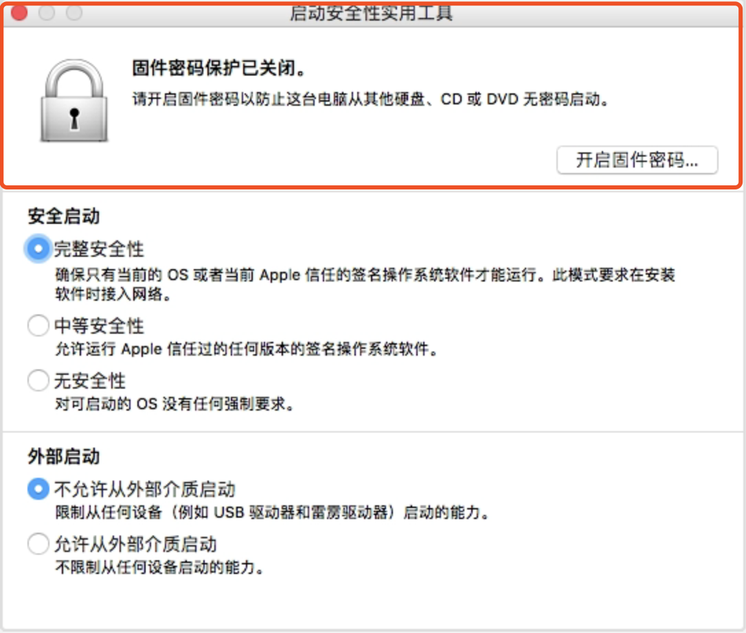 然后我重启按了command+r,打开了启动安全性实用工具,但是弹出来的窗口和苹果官网那个回答里的不一样,我的电脑只显示了红框里的部分,没有下面“安全启动”和“外部启动”的选项。。。