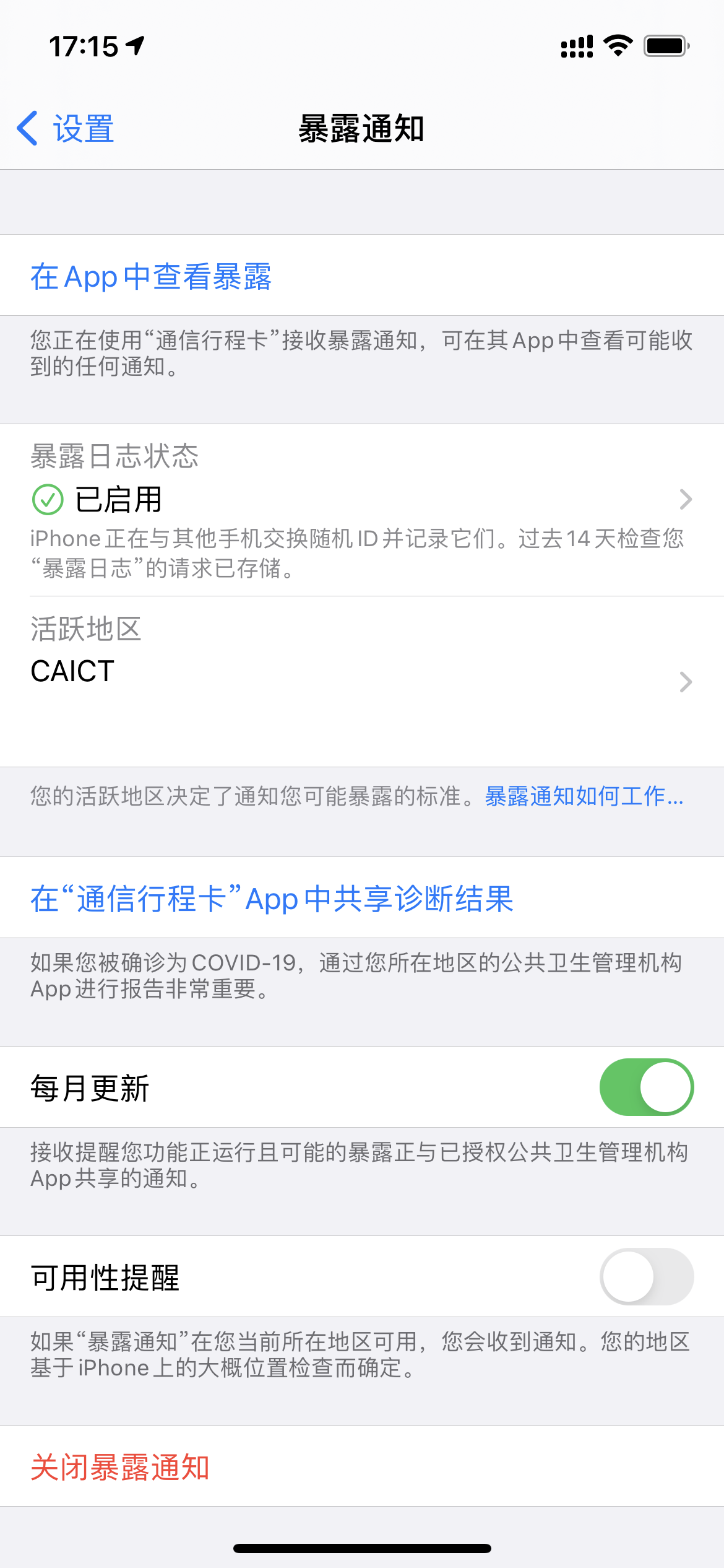 问题被标记为 排名最靠前的回复 以下用户的用户个人资料: SparkWu SparkWu 用户级别: 级别 7 28,336 积分 2021年1月14日 上午5:45 回应 PB02 如果你国家或地区有提供相应 App,先下载安装这个 App。如果你在中国大陆,请下载“通信行程卡”。打开相应 App,同意其蓝牙、通知及暴露通知隐私权限。部分 App 可能需要在 App 进行登录。在“设置”>“通信行程卡”(或是你所在国家或地区所使用的 App 名称)>“暴露通知”中确保“共享暴露信息”和“共享出行状态”开启。确保“设置”>“暴露通知”中“暴露日志状态”显示为“已启用”即为正常工作状态。 回复 链接