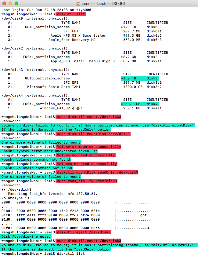 4:sudo fsck_hfs -fy /dev/disk2 5:ps aux | grep fsck 6:sudo pkill -f fsck 7:diskutil eject /dev/disk2