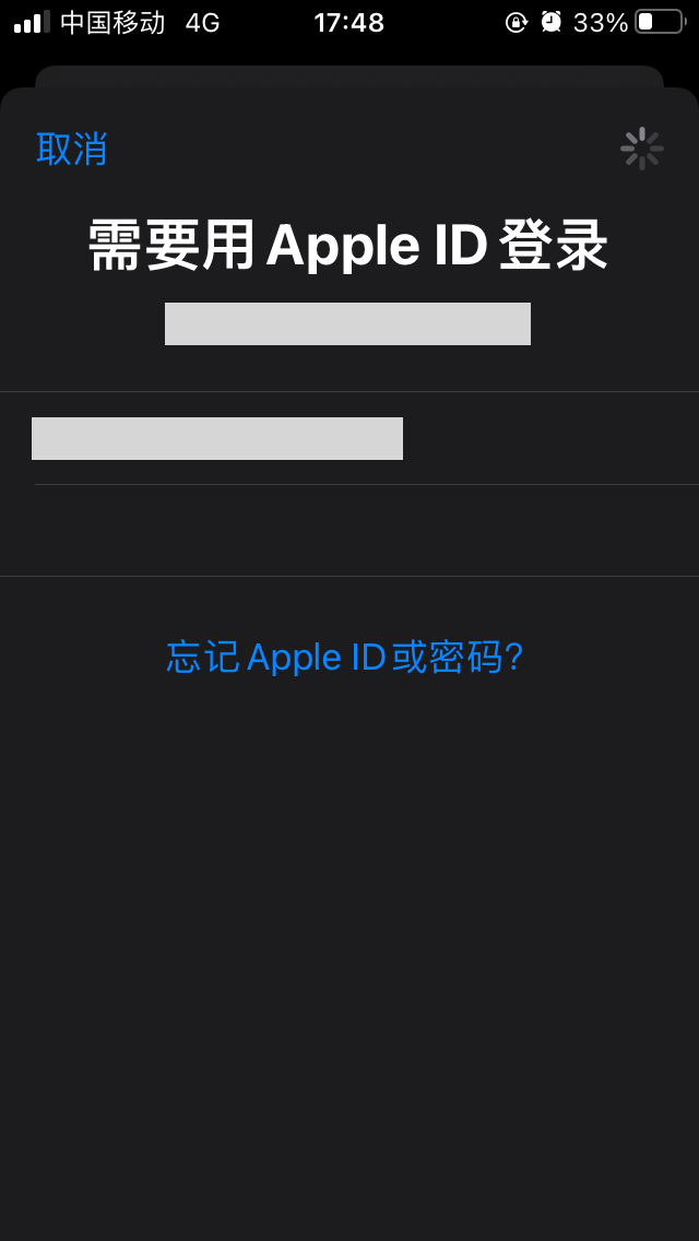 点击登录后,就没有反应了。点击使用其他Apple id可以弹出登录,输入Apple id后,就一直在下面的样子