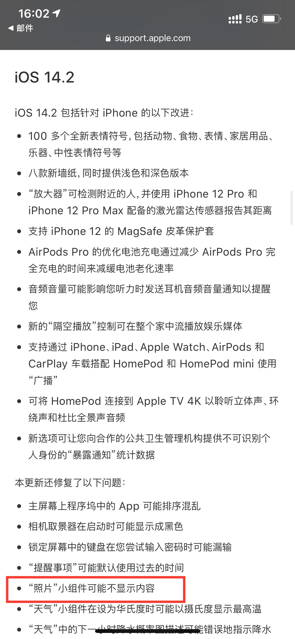 问题被标记为 排名最靠前的回复 以下用户的用户个人资料: SparkWu SparkWu 用户级别: 级别 7 28,336 积分 2021年1月19日 下午9:11 回应 头牌 更新一下系统吧。这个问题在 iOS 14.2 的时候就修复了。参考 https://support.apple.com/zh-cn/HT211808#142 回复 链接