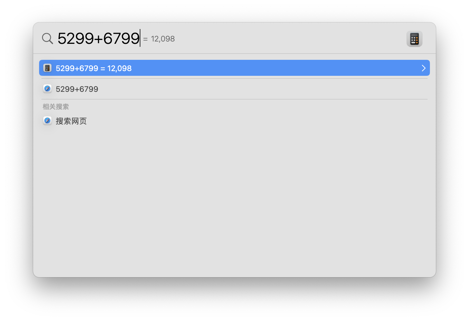 如果题主是日常的简单运算,可以直接在“聚焦”中就可以完成计算,在 Mac 上使用 Command - 空格 组合键(默认)就会弹出聚焦搜索栏,然后输入自己想要计算的式子即可得出结果,这样的方式既简单又高效。
