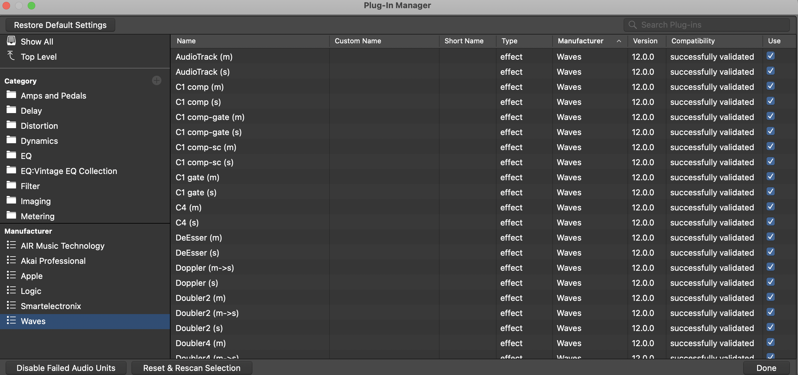 我碰到一个很奇怪的问题,我的插件在插件管理器中全部显示的是 successfully validated, 并且勾选了 use,但是我却无法在轨道中找到这个插件。例如下图中的waves插件在插件管理其中看起来都是正常验证完成的,但是在音频轨道中打开 Audio FX里会发现少了很多Waves的插件(比如C1 comp)。我尝试了很多方法都无法解决。包括: