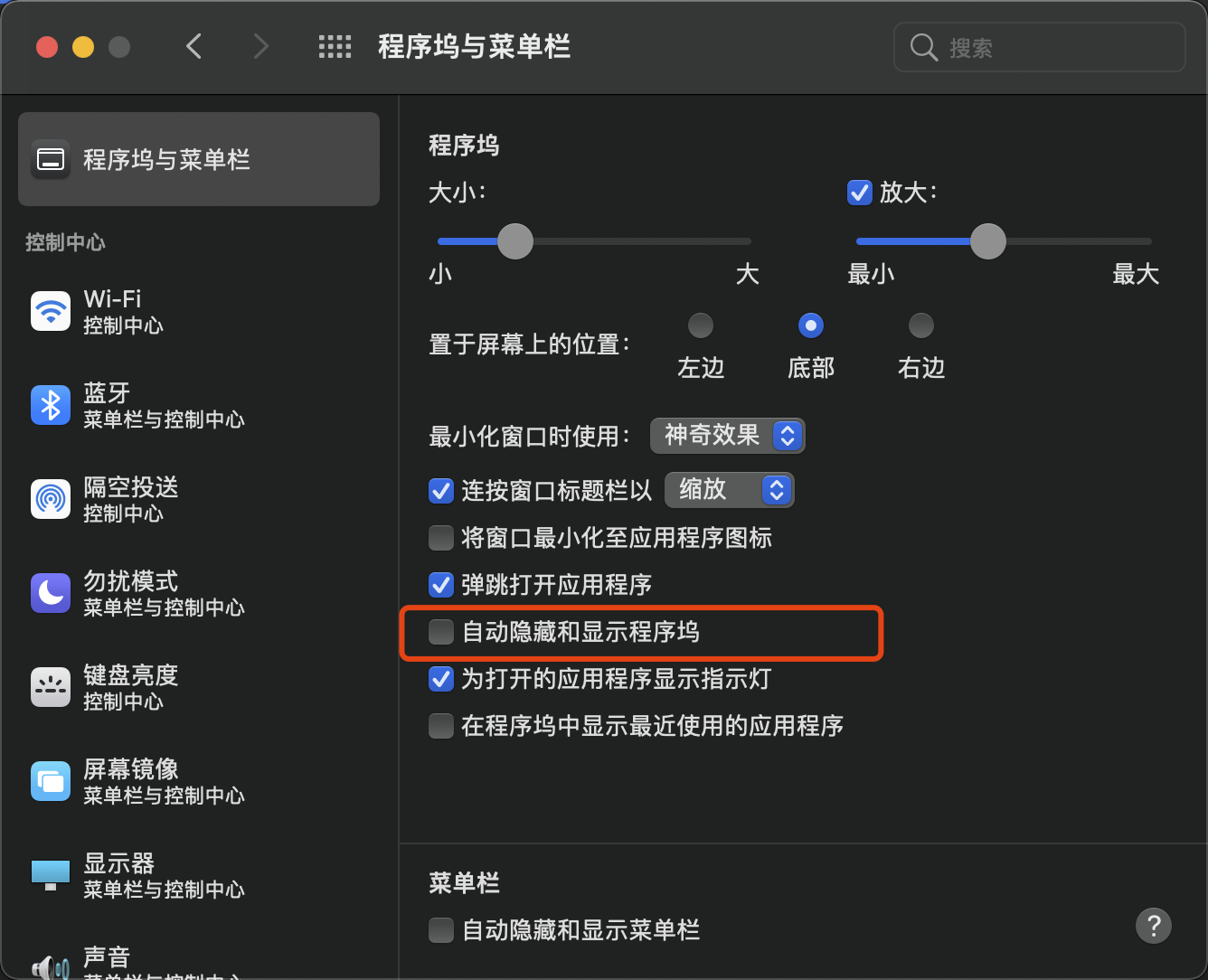 “程序坞与菜单栏”-“自动隐藏和显示拓展坞” 程序拓展坞不会显示
