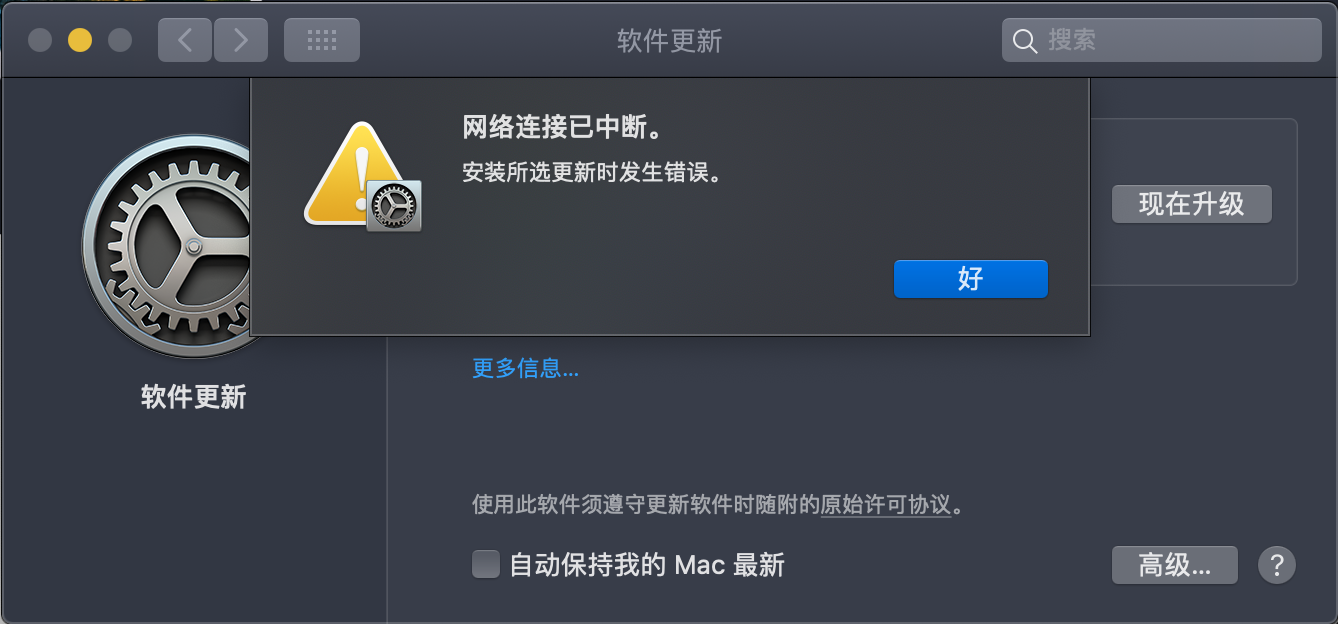 目前系统版本Mojave 10.14.6。不管是更新到Big Sur,还是Catalina,都会更新到1%以内网络就会中断。不论是介入学校的Wi-Fi,还是连手机热点。Safari下载东西也会出现同样的情况,所以我都是用Chrome或者FDM下载。我猜想,macOS搭载在Safari上的下载,对网络中断太敏感了,按理来说,下载过程中网络中断应该等待重连才对,而不应该一下子就取消了下载。