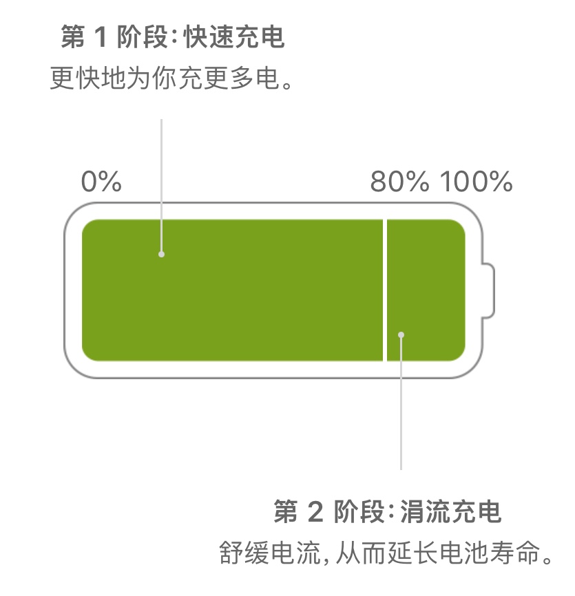 Apple 锂离子电池采用快充方式,迅速达到 80% 的电量,然后转换至较慢的涓流充电。根据设置和充电设备的不同,充满最初 80% 电量所用的时间将有所差异。当电池超出建议的温度时,软件可能会在电量达到 80% 之后限制充电。这种组合流程不仅能让你更快地带上设备出门,同时还能延长电池的寿命。