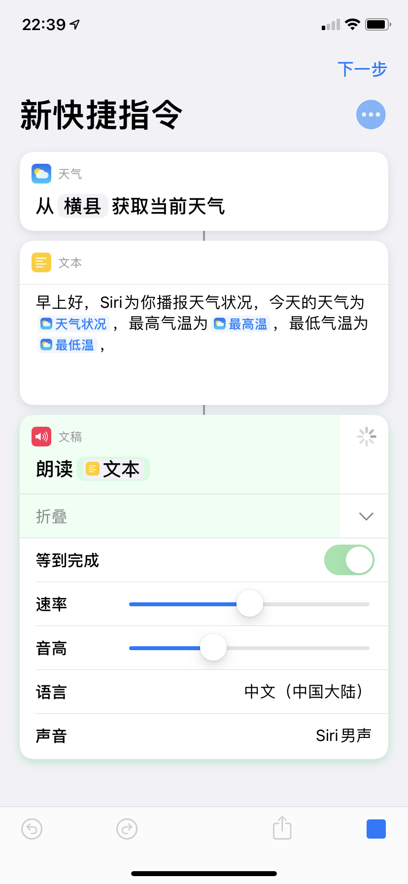 自己在快捷指令中设置特定时间语音天气播报,在设置朗读>语言为中国大陆>声音为> Siri男声和Siri女声,在快捷指令APP测试中没有问题,但在保存选定特定的时间运行后无法正常播报!原因不明。望求解。