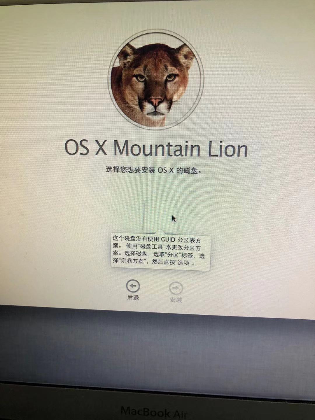解决:在启动 OS X Moutain Lion 启动后,在菜单中选择磁盘工具,然后抹掉内置盘,使用 GUID 分区表方案,分区使用 日志型的 Mac OS 扩展 (也就是 JHFS+)。分区完成后,再开始安装。